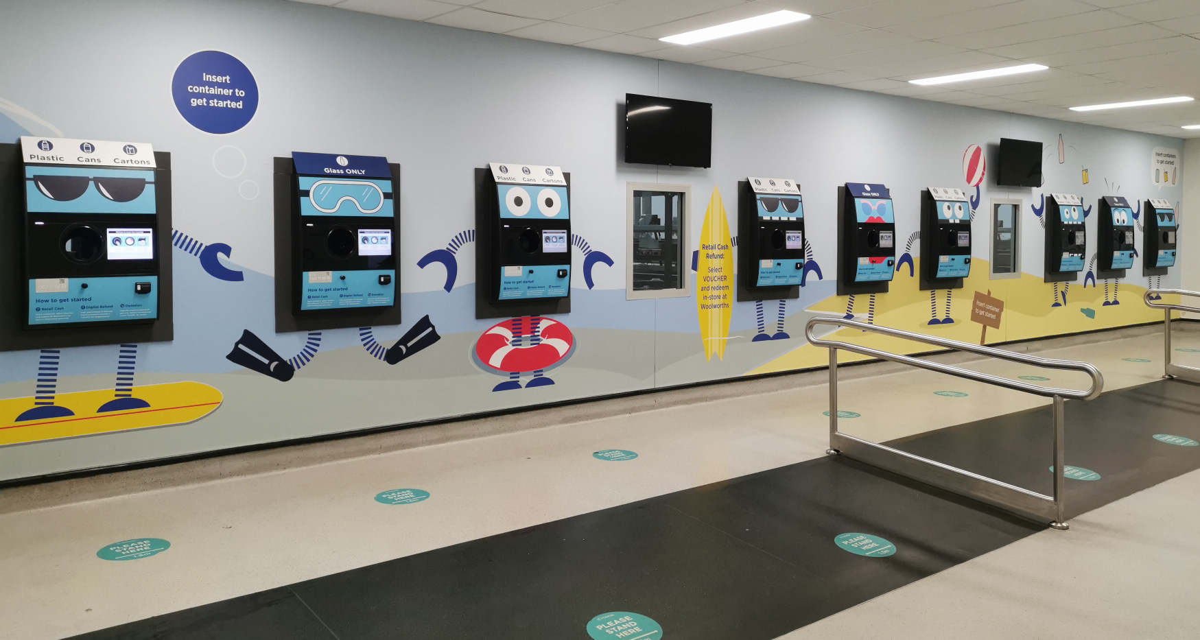 The self return system was an essential part of the center’s functionality. Allowing the user to simply drop off large volumes of containers, and receiving a digital payout. This was a new concept and requires the users to download an app - therefore I worked alot on implementing instructional, visual elements throughout the center to help create a seamless experience for the user.